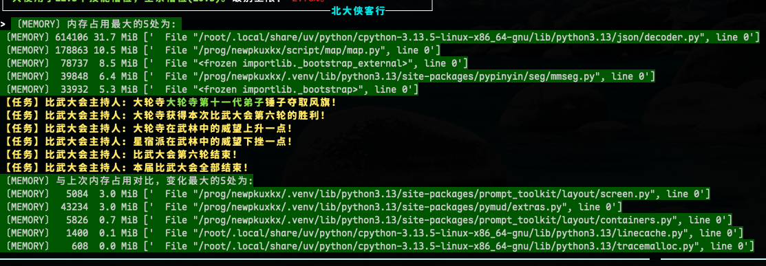 PyMUD 0.22.2a2预览版已推送到 pypi.org, 感兴趣的可以尝鲜。相对于 0.22.2a1 版和 0.22.1 版主要修改包括: 功能新增: 可以通过.cfg文件指定 "auto_chars" 来定义启动pymud时自动打开的会话。(0.22.2a1新增) 问题修复: 修复GMCPTrigger类型enabled属性不生效问题。 (0.22.2a1新增) 问题修复: 修复添加/删除系统时钟回调时,可能会导致的异常问题。(0.22.2a2新增) 问题修复: 修复在增加系统时钟回调时,如果回调函数代码错误产生异常,会导致系统时钟停顿的问题。(0.22.2a2新增) auto_chars 示例 以下 pymud.cfg 代码可以让运行pymud时自动打开会话并登录 mychar2 和 mychar4 : { "sessions": { "pkuxkx": { "host": "mud.pkuxkx.net", "port": "8081", "encoding": "utf8", "autologin": "{0};{1}", "default_script": ["main"], "chars": { "mychar1": ["mycharid1", "mypassword1"], "mychar2": ["mycharid2", "mypassword2"], "mychar3": ["mycharid3", "mypassword3"], "mychar4": ["mycharid4", "mypassword4"], } } }, "auto_chars": ["mychar2", "mychar4"] } 0.22.2a2版修复的错误概述 本版修复的两个错误主要解决 websocket 插件会调用系统时钟回调来处理sendOverview,但添加/移除回调或者回调写错都会导致系统时钟停止的问题。系统时钟停止后,会导致sendOverview不会再被调用刷新,且控制台ui的连接时间也不会保持每秒自动刷新,而只是随数据变化刷新。
