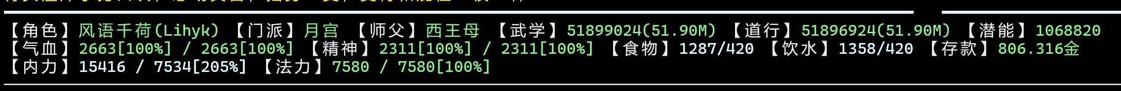 后边慢慢优化 [image: 1767879258627-2555386c-a39e-456b-bf6e-695debf3c628-image-resized.png] # 清华西游记状态栏和状态窗口 import webbrowser, asyncio, ast from pymud import Session, IConfig, alias, trigger, timer, gmcp, exception, Trigger, SimpleTrigger, SimpleAlias, GMCPTrigger, Command from wcwidth import wcswidth from utils.utils import experience_in_M class MyConfig(IConfig): def __init__(self, session: Session, *args, **kwargs) -> None: super().__init__(session, *args, **kwargs) # 将自定义的状态窗口函数赋值给会话的status_maker属性,这样会话就会使用该函数来显示状态信息。 self.session.application.set_status('当前任务:未知') # 未来可以作为当前任务的状态栏 self.session.status_maker = self.status_window def __unload__(self): super().__unload__() # 创建自定义的健康条用作分隔符 def create_status_bar(self, current, maximum, actual_max, bar_length = 20, bar_char = "—"): """ 创建一个健康条,用于显示当前健康值、有效健康值和剩余健康值。 :param current: 当前健康值 :param maximum: 当前最大健康值 :param actual_max: 真实最大值 :param bar_length: 健康条的长度 :param bar_char: 健康条的填充字符 :return: 一个包含健康条的列表 """ # 气血: 1153/ 1702 ( 64%) 内力: 10943 / 5659 (100%) (+360) bar_line = list() char_width = wcswidth(bar_char) # 计算有效健康值 filled_length = int(round(bar_length * current / actual_max / char_width)) # 计算有效健康值部分的长度 current_max_length = int(round(bar_length * maximum / actual_max / char_width)) # 计算剩余部分长度 remaining_length = bar_length - current_max_length # 构造健康条 bar_line.append(("fg:lightcyan", bar_char * filled_length)) bar_line.append(("fg:yellow", bar_char * (current_max_length - filled_length))) bar_line.append(("fg:red", bar_char * remaining_length)) return bar_line # 自定义状态栏窗口。该函数会被渲染框架高频调用,请注意不要在该函数中 info 或者执行其他输出信息!!! def status_window(self): styles = { "title" : "bold", "value" : "lightgreen", "value.better" : "lightcyan", "value.worse" : "yellow", "value.worst" : "red" } try: formatted_list = list() # line 0. hp bar kee = int(self.session.getVariable("kee", 0)) max_kee = int(self.session.getVariable("max_kee", 1)) kee_percent = int(self.session.getVariable("kee_percent", 1)) actual_max_kee = int(round(max_kee / (kee_percent / 100))) sen = int(self.session.getVariable("sen", 0)) max_sen = int(self.session.getVariable("max_sen", 1)) sen_percent = int(self.session.getVariable("sen_percent", 1)) actual_max_sen = int(round(max_sen / (sen_percent / 100))) bar_char = "━" screenwidth = self.session.application.get_width() bar_length = screenwidth // 2 - 1 span = screenwidth - 2 * bar_length kee_bar = self.create_status_bar(kee, max_kee, actual_max_kee, bar_length, bar_char) sen_bar = self.create_status_bar(sen, max_sen, actual_max_sen, bar_length, bar_char) formatted_list.extend(kee_bar) formatted_list.append(("", " " * span)) formatted_list.extend(sen_bar) formatted_list.append(("", "\n")) # line 1. char, family, master, deposit, food, water, exp, pot formatted_list.append((styles["title"], "【角色】")) formatted_list.append((styles["value"], "{0}({1})".format(self.session.getVariable('name'), self.session.getVariable('id')))) formatted_list.append(("", " ")) formatted_list.append((styles["title"], "【门派】")) formatted_list.append((styles["value"], "{}".format(self.session.getVariable('family')))) formatted_list.append(("", " ")) formatted_list.append((styles["title"], "【师父】")) formatted_list.append((styles["value"], "{}".format(self.session.getVariable('master')))) formatted_list.append(("", " ")) formatted_list.append((styles["title"], "【武学】")) formatted_list.append((styles["value"], "{}".format(self.session.getVariable('combat_exp')))) formatted_list.append((styles["value"], "({})".format(experience_in_M(self.session.getVariable('combat_exp'))))) formatted_list.append(("", " ")) formatted_list.append((styles["title"], "【道行】")) formatted_list.append((styles["value"], "{}".format(self.session.getVariable('daoxing_exp')))) formatted_list.append((styles["value"], "({})".format(experience_in_M(self.session.getVariable('daoxing_exp'))))) formatted_list.append(("", " ")) formatted_list.append((styles["title"], "【潜能】")) formatted_list.append((styles["value"], "{}".format(self.session.getVariable('potential')))) # line 2. hp # a new-line formatted_list.append(("", "\n")) formatted_list.append((styles["title"], "【气血】")) if max_kee < actual_max_sen: style = styles["value.worst"] elif kee < 0.8 * max_kee: style = styles["value.worse"] else: style = styles["value"] if max_kee == 0: pct1 = pct2 = 0 else: pct1 = 100.0 * kee / actual_max_kee pct2 = 100.0 * max_kee / actual_max_kee formatted_list.append((style, "{0}[{1:3.0f}%] / {2}[{3:3.0f}%]".format(kee, pct1, max_kee, pct2))) formatted_list.append(("", " ")) formatted_list.append((styles["title"], "【精神】")) if max_sen < actual_max_sen: style = styles["value.worst"] elif sen < 0.8 * max_sen: style = styles["value.worse"] else: style = styles["value"] if max_sen == 0: pct1 = pct2 = 0 else: pct1 = 100.0 * sen / actual_max_sen pct2 = 100.0 * max_sen / actual_max_sen formatted_list.append((style, "{0}[{1:3.0f}%] / {2}[{3:3.0f}%]".format(sen, pct1, max_sen, pct2))) formatted_list.append(("", " ")) formatted_list.append((styles["title"], "【食物】")) food = int(self.session.getVariable('food', '0')) max_food = int(self.session.getVariable('max_food', 350)) if food < 100: style = styles["value.worst"] elif food < 200: style = styles["value.worse"] elif food < max_food: style = styles["value"] else: style = styles["value.better"] formatted_list.append((style, "{0}/{1}".format(food, max_food))) formatted_list.append(("", " ")) formatted_list.append((styles["title"], "【饮水】")) wat